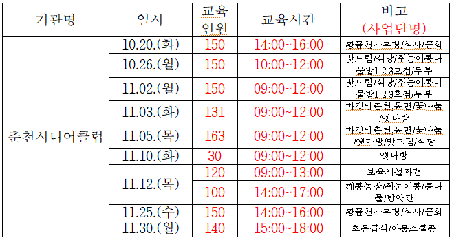 교육 일정을 참조 하시어 각사업 참여 어르신들은 교육참여에 협조하여 주시기 바랍니다.