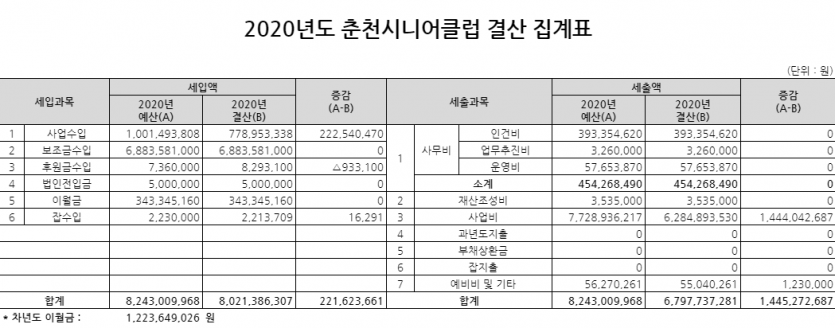 춘천시니어클럽 2020년 세입세출결산을 공고합니다.