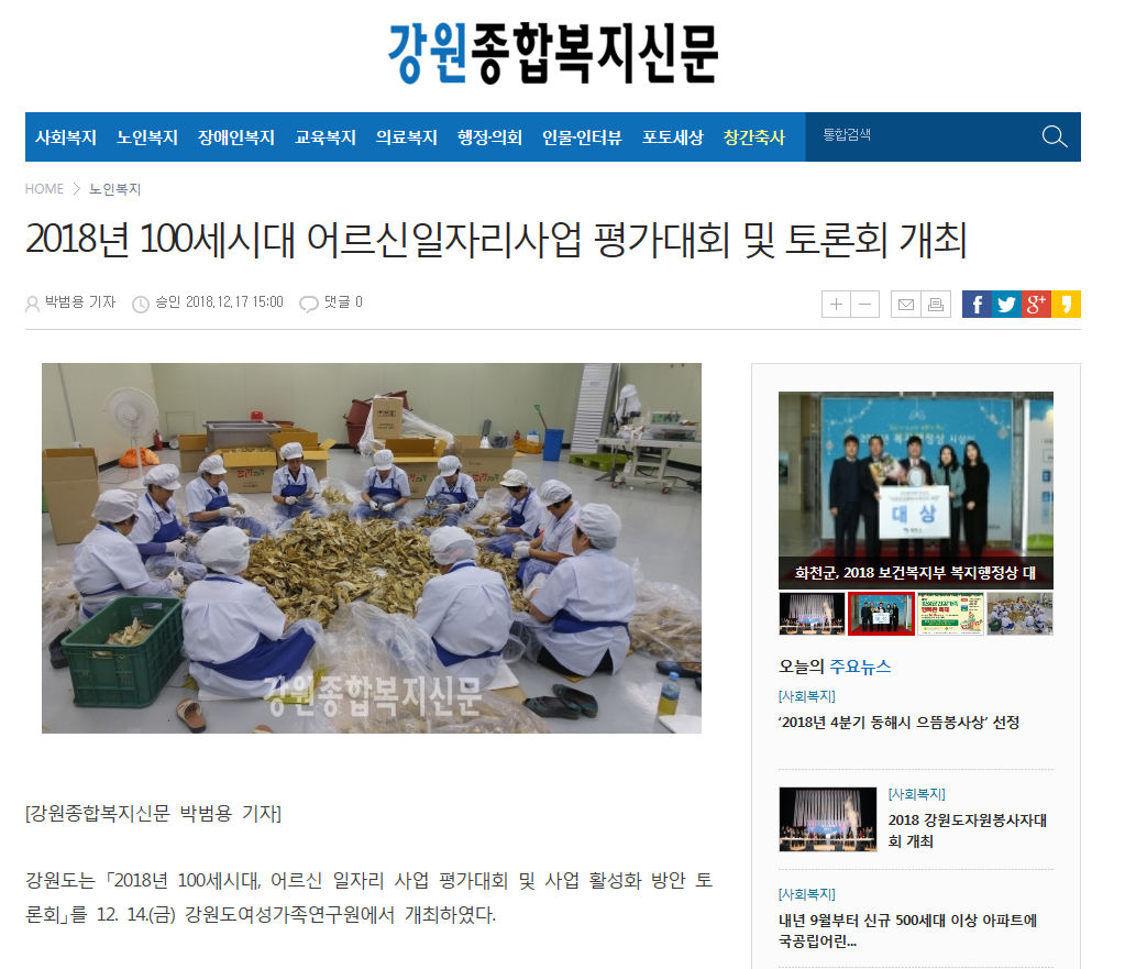 2018년 100세시대 어르신일자리사업 평가대회 및 토론회 개최(강원종합복지신문)