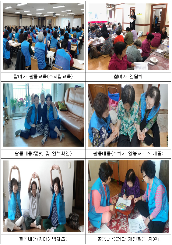 취약노인가정을 방문하여 일상생활을 유지할 수 있도록 말벗 및 건강프로그램 등 필요한 서비스를 제공하는 활동